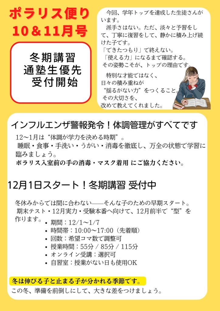 ポラリス便り ポラリス便り10&11月号 inoue 2025年11月18日 Follow me! お気軽にお問い合わせください。079-222-1315受付時間 9:00-21:00 電話メール FacebookXBlueskyHatenaCopy 中学生 受験 姫路 中学入試 算数 冬期講習 数学 塾 個別指導 小学生 ポラリスへのお問い合わせは お気軽にお問い合わせください。079-222-1315受付時間 9:00-21:00 電話 メール お気軽にお問い合わせください。079-222-1315受付時間 9:00-21:00 電話メール FacebookXBlueskyHatenaCopy